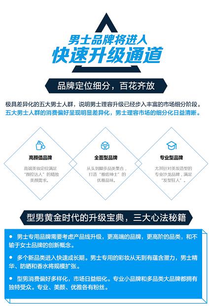 《中国男士理容白皮书》指出:中国的男士理容市场正在步入丰富的细分阶段,更多男士消费者的理容习惯已不限于面部基础护理,而是开始向往更加精细化、专业化、高端化的产品,男士理容也有望成为化妆品市场中最具增长活力的品类。《白皮书》基于对全域消费者的真实购买行为和产品使用习惯展开全面剖析,创造性地将中国男士划分为五大个性鲜明的类型:男士铁粉、雅痞绅士、颜控达人、发型狂人和金刚直男。