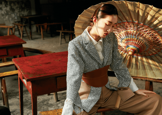 烟雨氤氲,风花飘落,古镇女子摇晃着手中的那把油纸伞,隐匿在雨雾缠绵的青石雨巷,山野田间着。通过柔雾光感底妆,红棕色系光韵眼妆,黄色落英式腮红,以及局部点缀的雀斑让正处豆蔻年华、古朴真挚的古镇女子形象跃然在镜头里。
