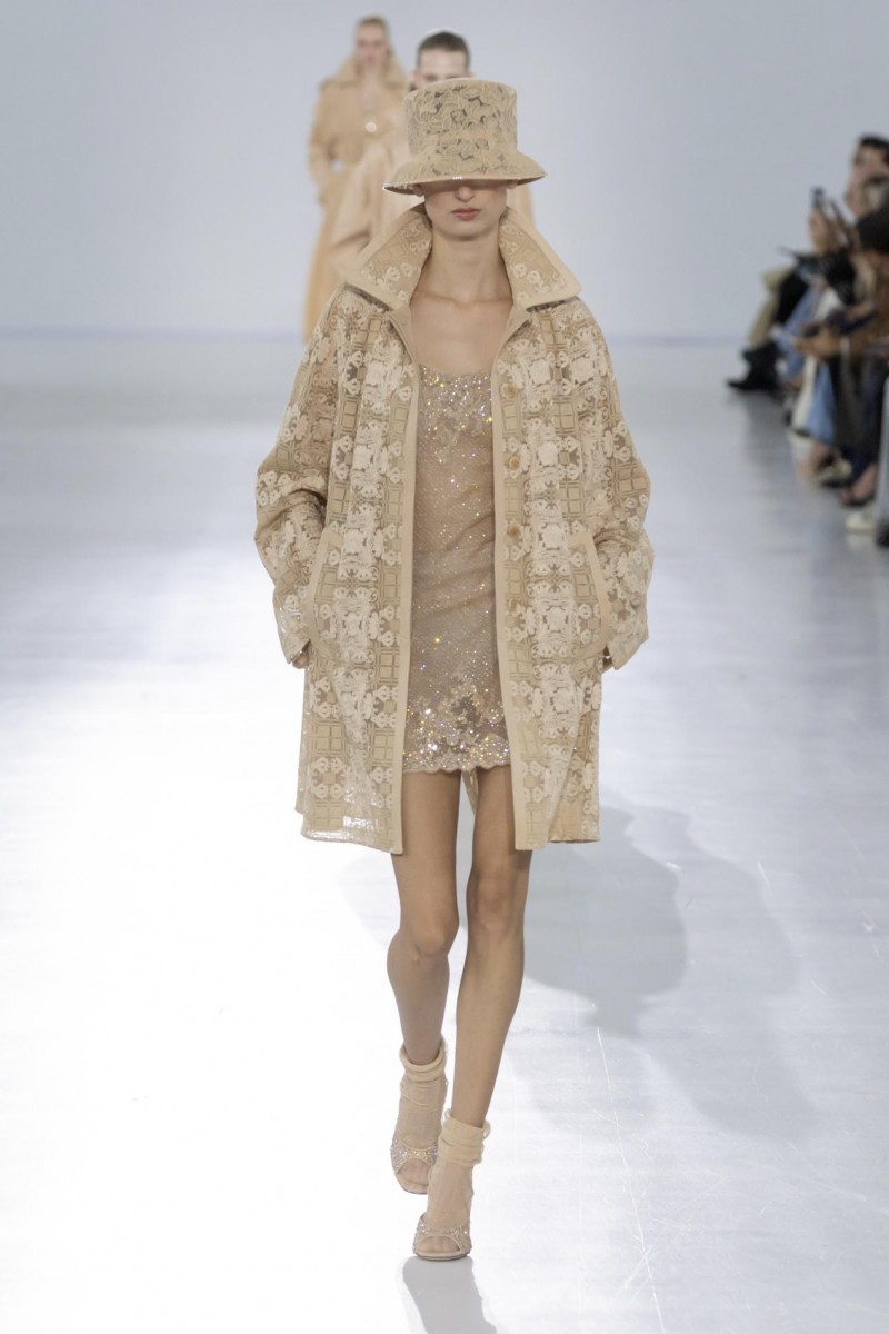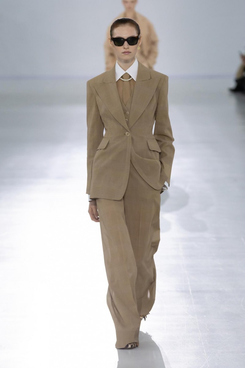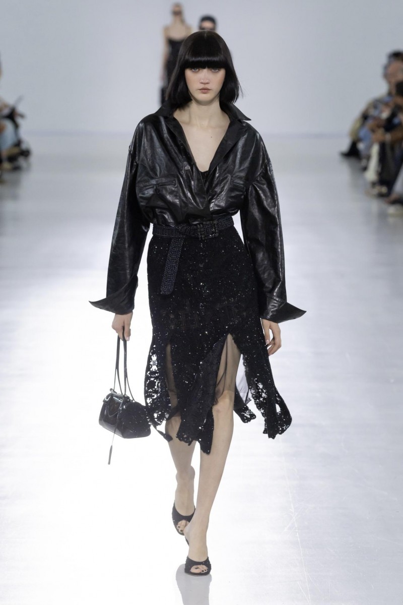 材质与面料通过工艺革新实现平衡与蜕变。经典的"鸢尾花瓣"叠层工艺,让雪纺在保持空灵通透的同时,铸造意想不到的廓形结构,它依旧是雪纺,却焕发出前所未有的新生,这甚至运用于西装剪裁之中。同样,如羽毛般轻盈的细腻纳帕皮革被压褶成不规则形态,却始终保持着原有的柔润光泽。