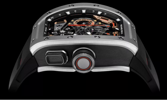 在RM UP-01中,传统表冠被两个嵌入式按钮取代,分别用于功能选择与调校。这种设计不仅顺应超薄结构的工程需求,更汲取了赛车控制台的操作逻辑,带来更快更准的操控体验。
