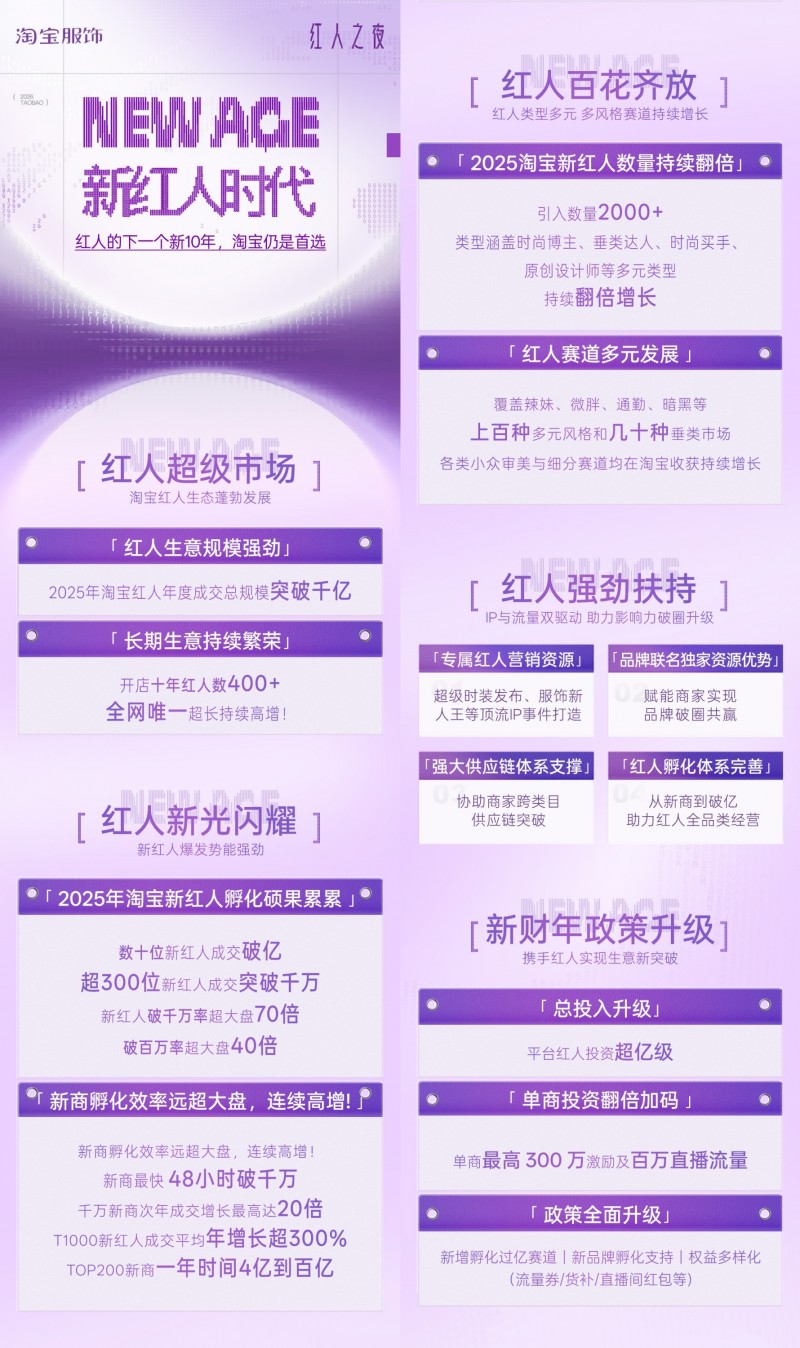 今年,淘宝以真金白银和全域资源,再度加码对新红人的投资。单个商家有机会获最高300万现金激励,再叠加超5000万流量曝光及百万级直播资源。此外,还将继续通过「服饰新人王」、「超级时装发布」等项目,助力红人实现从个人IP到品牌化的跃迁。